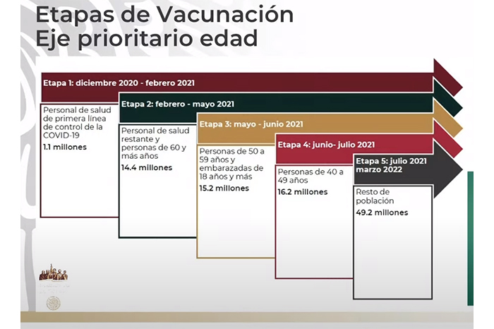 Durante la conferencia matutina del presidente Andrés Manuel López Obrador, este viernes, el doctor Ruy López Ridaura, director general del Centro Nacional de Programas Preventivos y Control de Enfermedades de la Secretaría de Salud federal, expuso que la meta es inoculizar a 11.4 millones de personas, de un total de 16.2 millones que conforman este rango de edad.